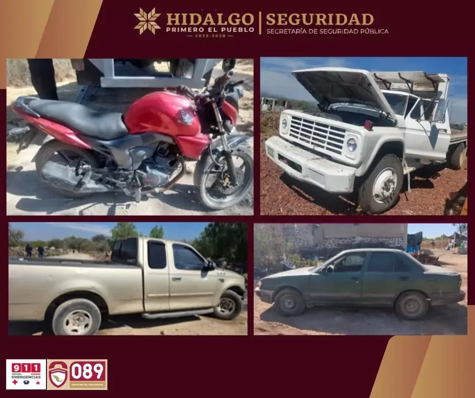 En el mismo sitio se logró el aseguramiento de nueve unidades, de las cuales cuatro camionetas y un camión contaban con reporte de robo, mientras que otras cuatro —una camioneta, un camión, un sedán y una motocicleta— se encontraban relacionados con estas acciones delictivas.