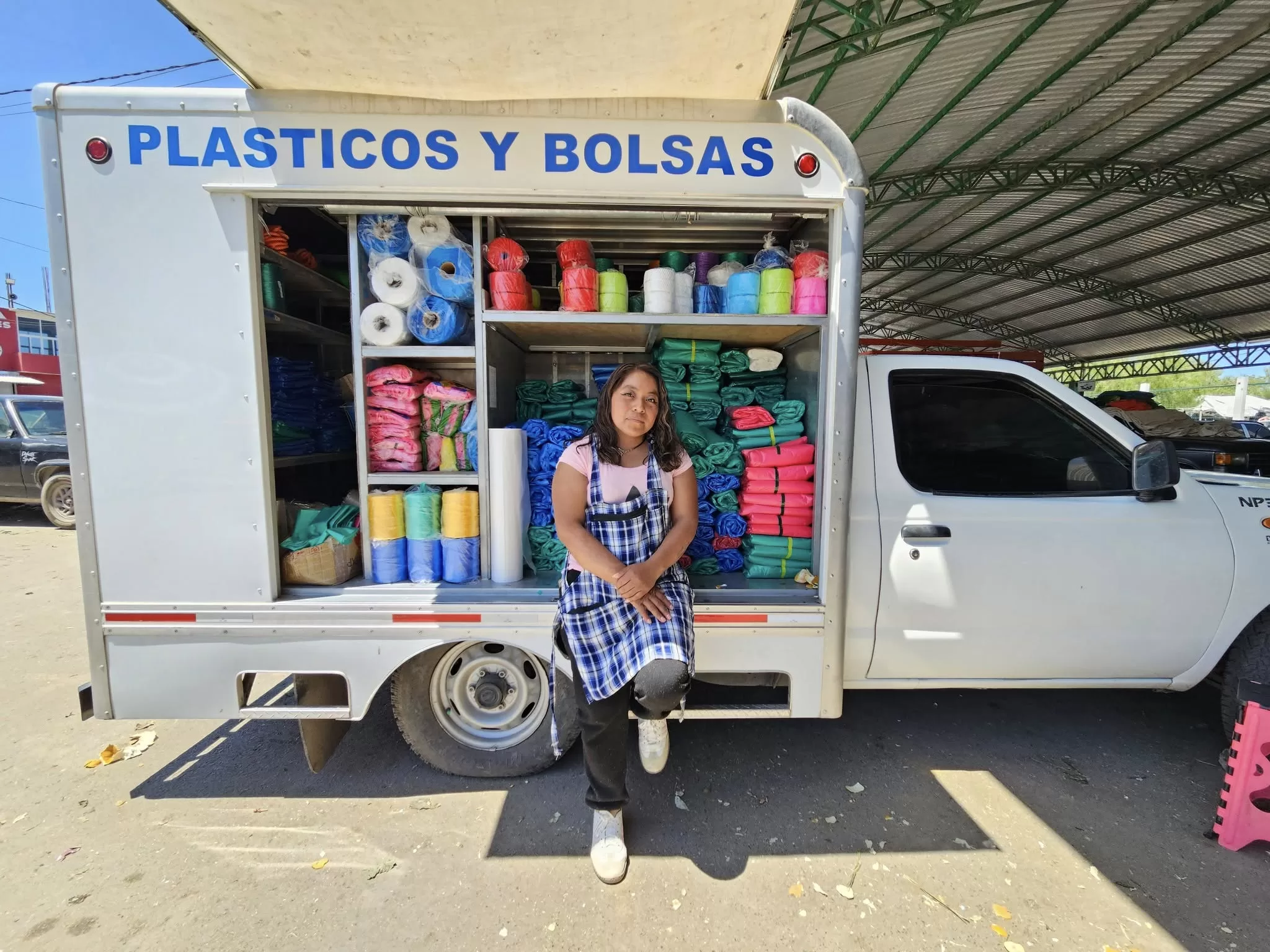 Ixmiquilpan, Hidalgo, 26 de junio de 2025. En el techado 2 del área de horticultores, una camioneta adaptada se ha convertido en un punto clave para el trabajo diario del campo: se trata de Plásticos y Bolsas “Aileen”, un pequeño negocio que abastece a productores con rafia, bolsas y otros insumos indispensables para empacar grandes cantidades de hortalizas que serán enviadas a las principales centrales de abasto del país.