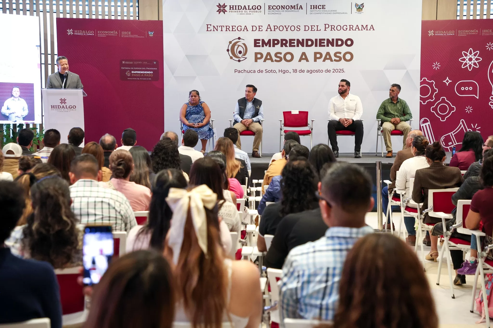 Pachuca de Soto, Hgo., 18 de agosto de 2025. Para fortalecer la economía local, el gobernador de Hidalgo, Julio Menchaca Salazar, encabezó la entrega de apoyos económicos del programa “Emprendiendo Paso a Paso 2025” a 190 personas emprendedoras en situación de informalidad, originarias de 52 municipios.