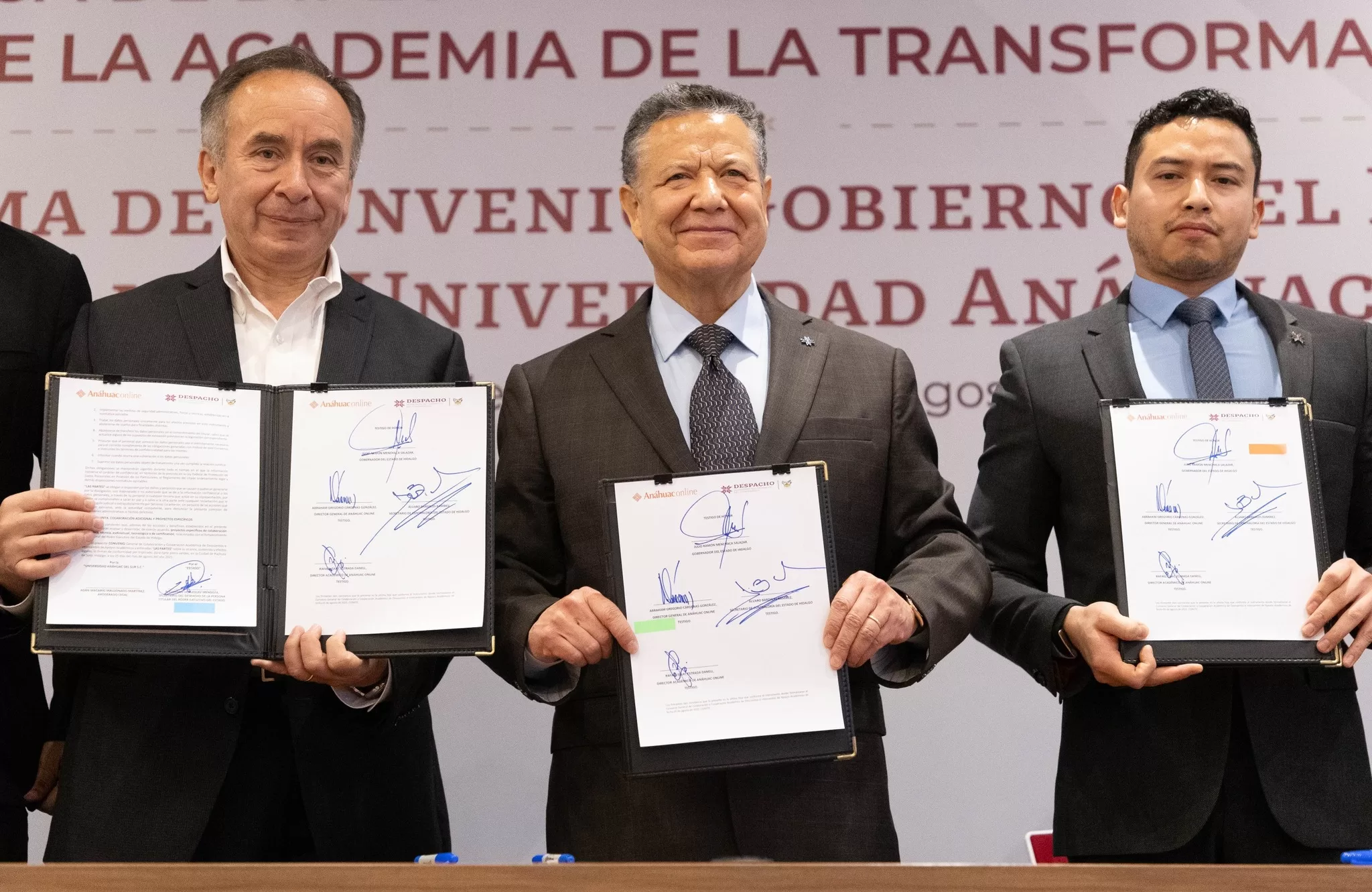 Pachuca de Soto, Hgo., 5 de agosto de 2025. Con el firme propósito de consolidar un servicio público eficiente y capaz de responder a las necesidades de la población, el gobernador de Hidalgo, Julio Menchaca Salazar, encabezó la entrega simbólica de diplomas a la tercera generación de la Academia de la Transformación, y firmó el convenio de colaboración entre el Gobierno del Estado y la Universidad Anáhuac Online.