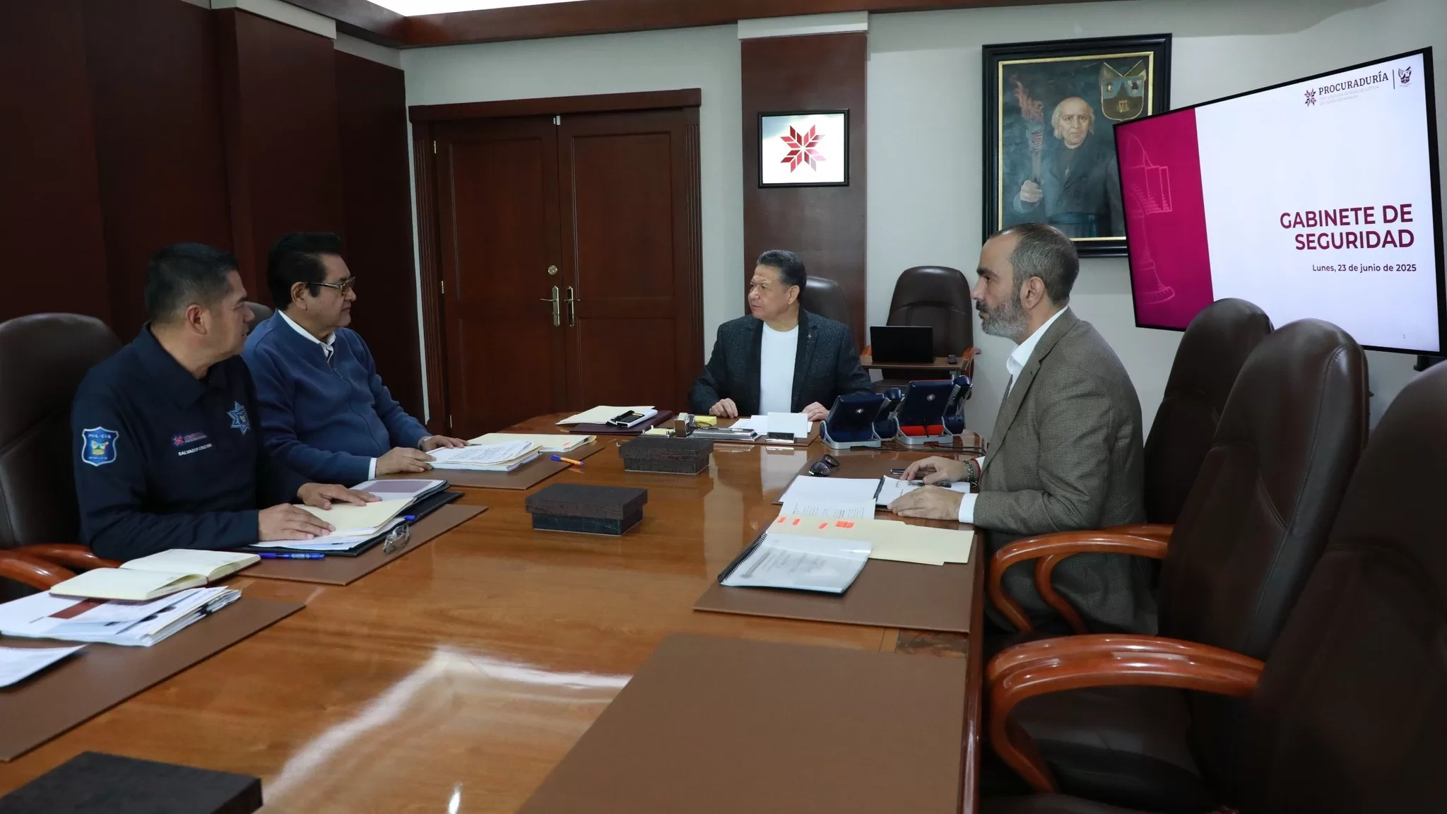 Pachuca de Soto, Hgo., 23 de junio de 2025. Durante la reunión semanal del Gabinete de Seguridad, el gobernador de Hidalgo, Julio Menchaca, dio seguimiento a las afectaciones generadas por el fenómeno meteorológico ‘Erick’, cuyas fuertes lluvias impactaron a múltiples regiones del estado.